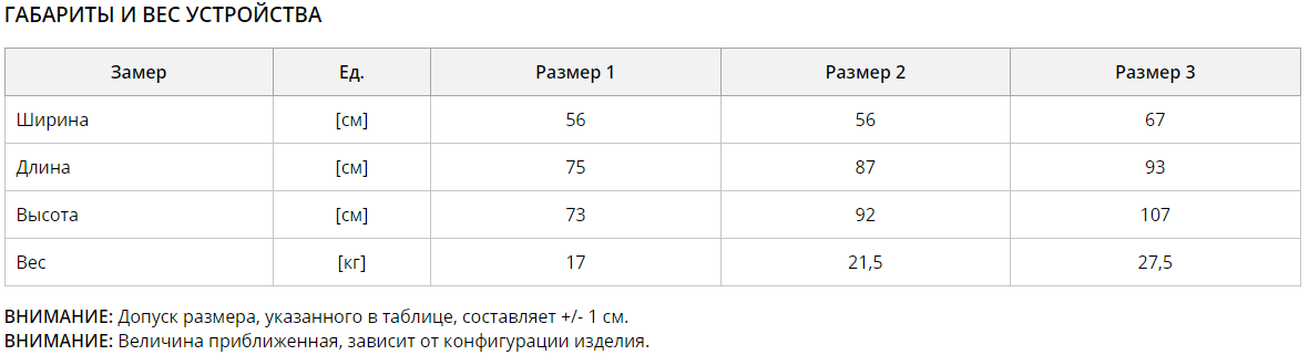 Таблица размеров: